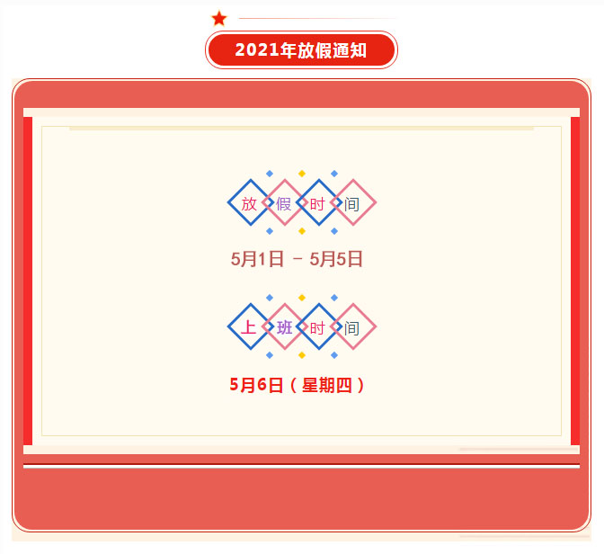 2021年五一“勞動節(jié)”假期將至,根據(jù)國家節(jié)假日放假規(guī)定,并考慮公司的實際情況,決定于2021年5月1日(星期六)至2021年5月5日(星期三)放假,共5天。2021年5月6日(星期四)正常上班。