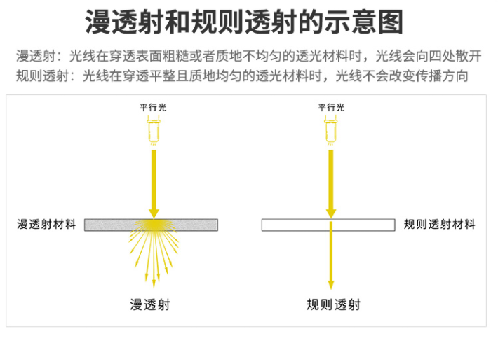 平行光源的光線穿過(guò)粗糙表面的透射材料(如磨砂、半透明、乳白玻璃)時(shí),透射光彌散開(kāi),在宏觀上不存在規(guī)則透射,稱之為漫透射。當(dāng)光線透過(guò)漫透射材料時(shí),我們從材料后面看到的的影像是模糊的。