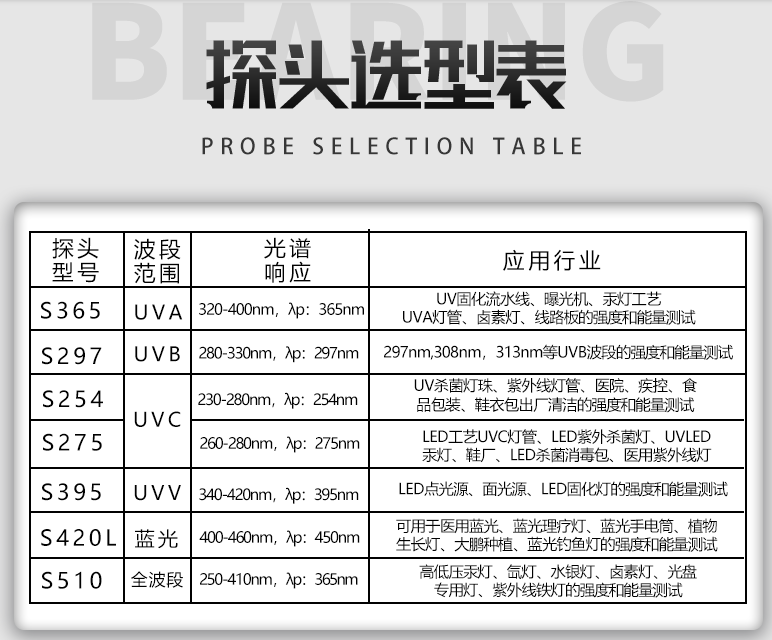 紫外線燈管是利用紫外線的特殊作用制成的燈管。廣泛用于竹木地板、家具、裝飾材料、印刷、印鐵制罐、塑膠涂裝、標牌、電路板、光盤等行業(yè);紫外線燈管也是半導體、電子元件、液晶等粘接固化的理想光源。紫外線燈管分為UVA波段(320nm-380nm),UVB波段(280nm-320nm)和UVC波段(200nm-280nm),不同波段的紫外線廣泛應用于殺菌,固化等眾多行業(yè),紫外線的強度及能量監(jiān)控也成為行業(yè)的標準,速德瑞的紫外線儀表主要分為紫外線能量計和紫外輻射照度計。