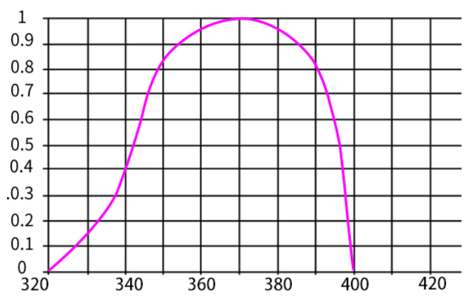 其實波長主要分為λp和λd,即峰值波長和主波長。峰值波長就是發(fā)光強度較大處所對應(yīng)的波長,是一種純粹的物理量,一般應(yīng)用于波形比較對稱的單色光的檢測。例如,速德瑞SDR365紫外輻照計主要用于紫外能量的檢測,其光譜波長范圍是320-400nm,中心波長為365nm。其光譜響應(yīng)圖如下: