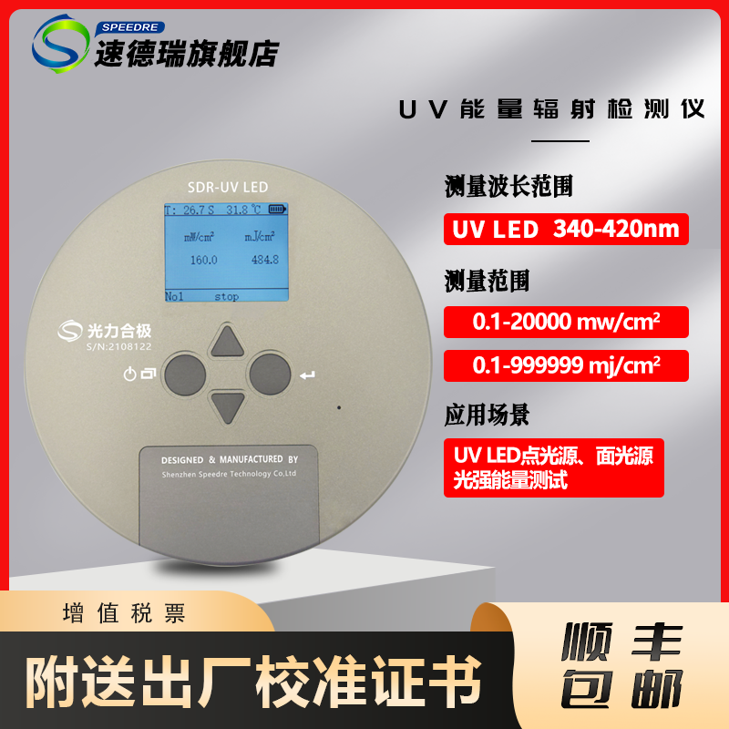 UV能量計在檢測UV平板打印機、紫外LED燈、UV固化機等光源強度中,以其獨特的優(yōu)勢發(fā)揮著廣泛作用。其中速德瑞科技的SDR-UV LED國產(chǎn)UV能量計,既能同時顯示能量值、光強和溫度,又能顯示功率曲線、溫度曲線。檢測時能清楚看到光源強度的分布情況,在越來越多的領(lǐng)域都得到了應(yīng)用。