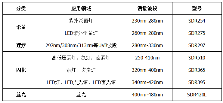 根據(jù)不同的應(yīng)用領(lǐng)域以為紫外線波段,我們進(jìn)行了以下不同類型的分類,如下圖所示,用戶可以根據(jù)下文中的建議進(jìn)行合理選擇。