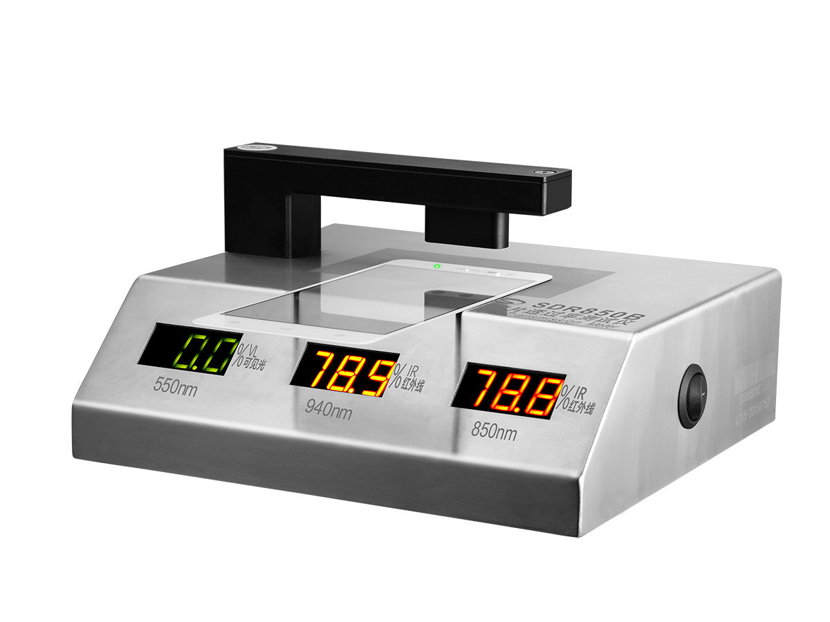 手機鏡片在生產時同樣要老虎到主屏的透光率,透光率過低會影響人查看手機的視覺效果。這里推薦使用速德瑞的SDR850B鏡片透光率測量儀,可以測量紅外840nm/940nm,可見光550nm的透過率,便攜臺式設計,即放即測,測量迅速,高準確度。