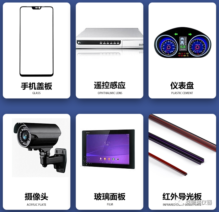 手機(jī)蓋板、手機(jī)屏、顯示屏、玻璃鏡片、遙控感應(yīng)、儀表盤、紅外導(dǎo)光條等需要測(cè)試可見光或紅外線透過率的產(chǎn)品。