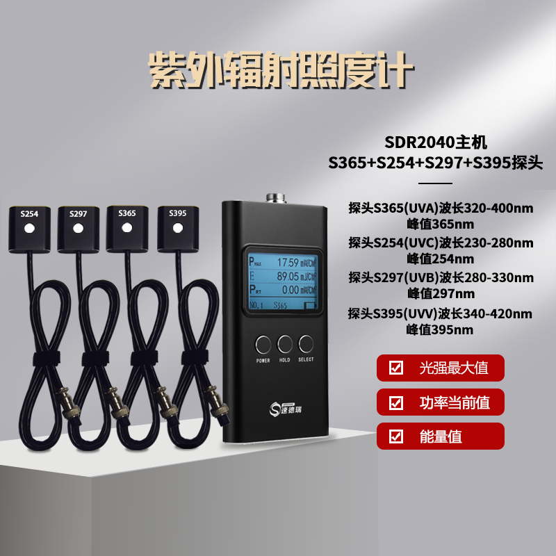 紫外輻照計(jì)顧名思義測量紫外線的儀器,主要用于測量紫外線的輻射能功率密度,即每平方厘米的輻射能功率。也是一款可測試UVA,UVB,UVC,UVV各種波段紫外輻射照度的多通道紫外輻射照度計(jì)。采用數(shù)字探頭,插拔式設(shè)計(jì),儀器智能判斷探頭的型號(hào),同時(shí)可以支持不同的紫外探頭。速德瑞紫外線輻照計(jì)包括UVA波段(320nm-400nm),UVB波段(280nm-330nm),UVC波段(230nm-280nm)以及UVV波段(340-420nm)共四種探頭可選擇。