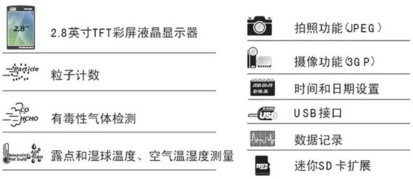 DT-9880空氣粒子計(jì)數(shù)器是最新推出的全球第一款2.8”真彩TFT液晶顯示屏的空氣質(zhì)量檢測(cè)儀。該產(chǎn)品具有獨(dú)創(chuàng)的視頻和照片拍攝功能,結(jié)合六通道空氣粉塵粒子計(jì)數(shù)、溫濕度測(cè)量、露點(diǎn)溫度測(cè)量及有毒氣體(CO、HCHO)檢測(cè)多功能于一體,適用于環(huán)保節(jié)能等廣泛領(lǐng)域,是您的工作更直觀和高效,是您更佳了解人類生活的空氣質(zhì)量和環(huán)境監(jiān)測(cè)與分析的好幫手。