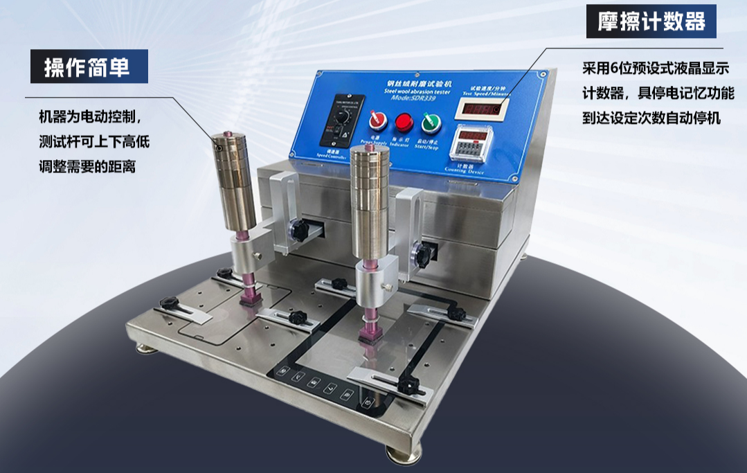 速德瑞SDR339鋼絲絨耐磨擦試驗機采用不銹鋼制作,耐腐蝕性能更佳;無段式可調整轉速頻率,且數顯轉速;采用6位預設式液晶顯示計數器,具停電記憶功能,到達設定次數自動停機;10~60次/min連續(xù)可調;10mm~50mm可自由調整;測試桿可上下高低調整需要的距離,專用于各類表面噴涂產品以及印刷字體的耐摩擦壽命試驗。