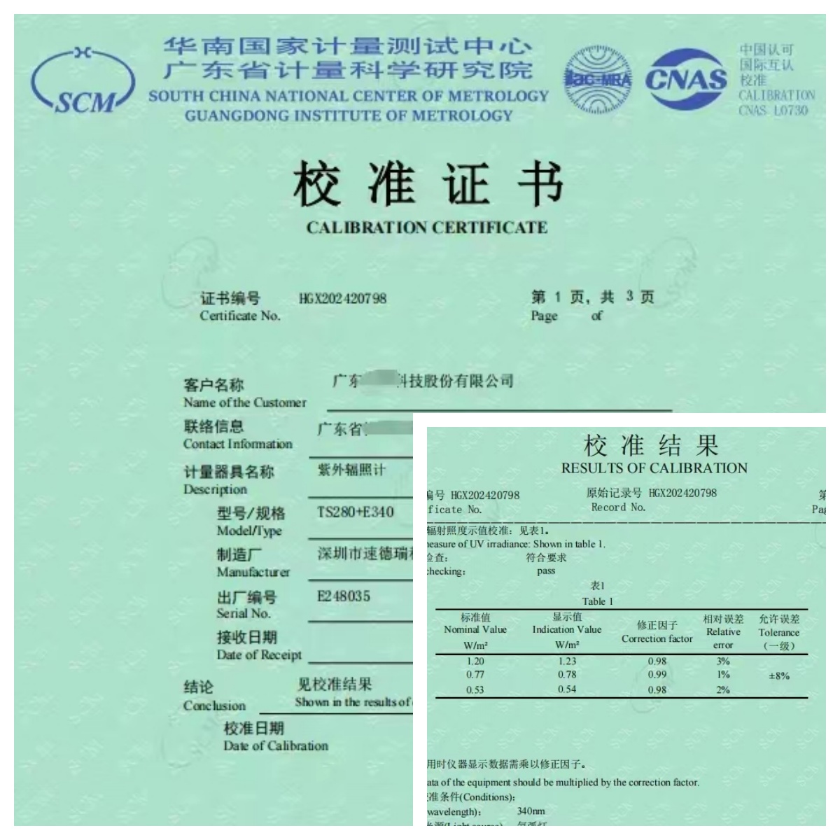 TS280紫外輻照計(jì)送檢華南計(jì)量院,計(jì)量結(jié)果達(dá)一級(jí)標(biāo)準(zhǔn)