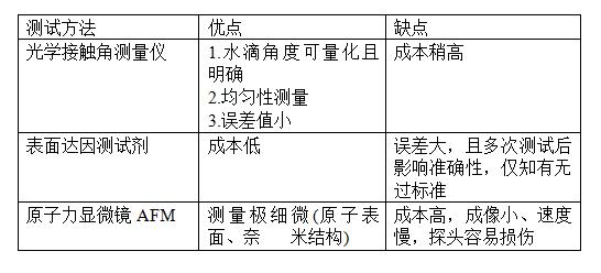 光學(xué)接觸角測量儀:是一種簡單、快速、靈敏的方法測量固體表面的潤濕性。且可間接測量固體表面能與液體表面張力。以下為測試方法比較表: