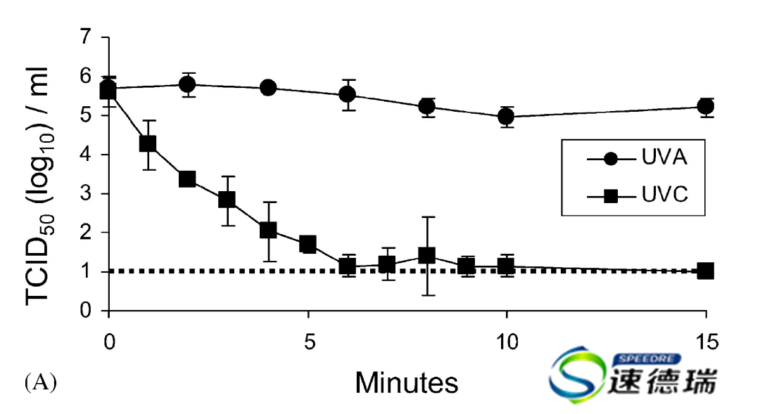 UVC特征波長為22nm-280 nm,在一定量輻射強度的深紫外光源照射下,病毒的殺滅率LOG值與劑量(時間)呈線性關(guān)系的規(guī)律。