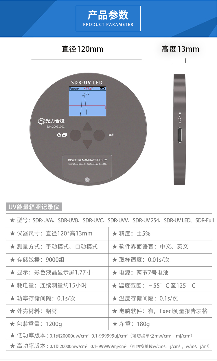 UV-SPEEDRE系列UV能量輻照記錄儀是一款高精度,高效率的UV能量輻射檢測儀器,主要適用于電子元件行業(yè),噴涂行業(yè),UV鍍膜行業(yè),印刷行業(yè)等各類需要用于測試高壓汞燈,低壓汞燈,氙燈,水銀燈、鹵素?zé)?、曬版燈、光清洗燈、光盤專用燈、紫外線鐵燈、殺菌消毒燈、短弧氙氣燈的光照強(qiáng)度和能量的檢測。